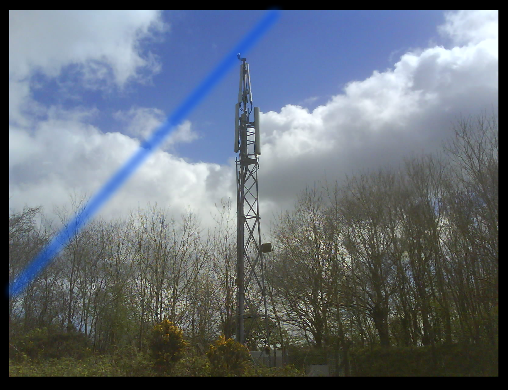 and shoots a blue light past an electric tower and burns the earth below.